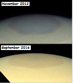 Between 2012 and 2016, the persistent hexagonal cloud pattern at Saturn’s North Pole changed from a mostly blue colour to more of a golden colour. One theory for this is a seasonal change: extended exposure to sunlight may be creating haze as the pole swivels toward the sun. It was previously noted that there was less blue colour overall on Saturn between 2004 and 2008.