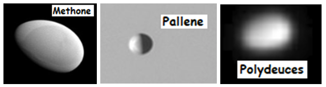 Icy moons of Saturn include Dione and Thethys, which are heavily cratered.