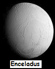 Enceladus is very bright and does not have its own magnetic field. Plumes of salty water can be seen escaping from its surface.