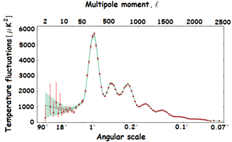 This graph shows the temperature fluctuations in the Cosmic Microwave Background detected by Planck at different angular scales on the sky. This curve is known as the power spectrum.