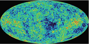 The cosmic microwave background (CMB) is an almost-uniform background of radio waves that fill the universe. The CMB is, in effect, the leftover heat of the Big Bang itself – it was released when the universe became cool enough to become transparent to light and other electromagnetic radiation, 100,000 years after its birth. At this time, the universe was filled with a hot, ionized gas. This gas was almost completely uniform, but did have slight deviations – spots that were slightly (1 part in 100,000) more or less dense. The slight changes in the intensity of the CMB across the sky (deviations of only than 1 part in 100,000) give us a map of the early universe. The picture below such a map, measured by the Wilkinson Microwave Anisotropy Probe (WMAP), a space-based microwave telescope for studying the CMB. By studying this map, astrophysicists have learned an enormous amount about the evolution and composition of the universe.