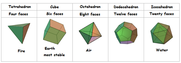 There was intuitive justification for these associations: the heat of fire feels sharp and stabbing (like little tetrahedra). Air is made of the octahedron; its minuscule components are so smooth that one can barely feel it. Water, the icosahedron, flows out of one’s hand when picked up, as if it is made of tiny little balls. By contrast, a highly nonspherical solid, the hexahedron (cube) represents “earth”. These clumsy little solids cause dirt to crumble and break when picked up in stark difference to the smooth flow of water. Moreover, the cube’s being the only regular solid that tessellates Euclidean space was believed to cause the solidity of the Earth.