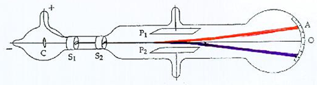 The basic features of Thomson’s apparatus are shown in the diagram above. The cathode C is at a negative potential of several hundred volts, and the anode S1 is earthed. The cathode rays travel towards the anode and pass through a slit in it. They continue through a second slit in the plug S2, and travelling in a straight line (shown black in the diagram) strike the end of the tube at the point O, where they produce a narrow well-defined phosphorescent patch. P1 and P2 are a pair of parallel metal plates across which a potential difference may be applied. This gives rise to an electric field in the space between them along which the cathode rays are travelling. If the plate P1 is positive the cathode rays are deflected upwards. They follow the path shown in red and produce a phosphorescent patch at the point A. A scale is pasted on the outside of the tube to measure the amount of the deflection.