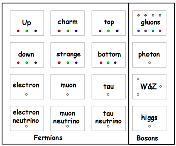 There are seventeen named particles in the standard model, organized into the chart shown below. The last particles discovered were the W and Z bosons in 1983, the top quark in 1995, the tau neutrino in 2000, and the Higgs boson in 2012.