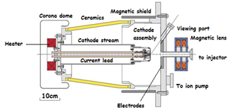 Heated cathode releases electrons by thermionic emission. The electrons are extracted by an electric field.