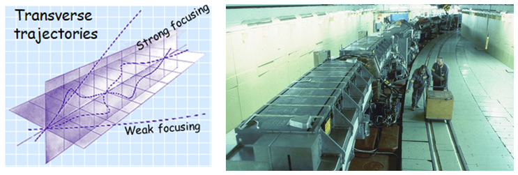 “Strong focusing” alternates focusing-defocusing forces (provided by quadrupoles) to give overall focusing in both X & Y planes.