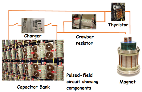The bank of capacitors stores charge, to provide current which is passed via the thyristors to the magnets. Energy needs to be dissipated in the resistor banks.