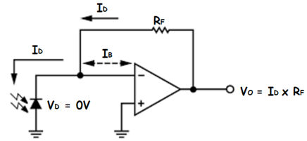 Vo is the output voltage; ID is the current generated in the photodiode; VD is the potential difference across the photodiode; IB is the base current and RF is the feedback resistance