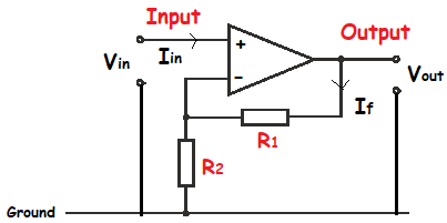 A = Vout/ Vin = 1 + (Rf/Rin) where R1 = Rf and R2 = Rin