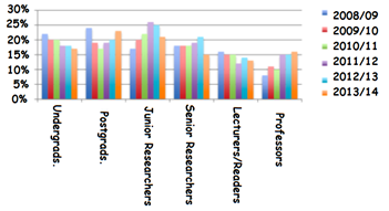 The above figure shows the percentage of females in the Oxford Physics Department at various stages of their career compared with similar UK institutions. Data are for 2012/13 from HESA. Staff categories are determined by HESA entries: “Fixed-term staff” roughly equates to junior postdocs; “Permanent staff” roughly equates to lecturer/reader/professor