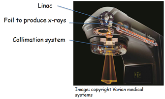 External beam radiation therapy uses x-rays, or photons, which are sometimes called “packets of energy,” to treat cancer. The higher the energy of the x-ray beam, the deeper the x-rays penetrate into the target tissue. Linear accelerators produce x-rays at various energies.