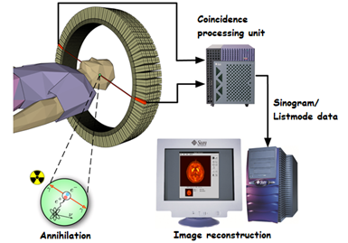 Positron emission tomography (PET) uses Fluorine-18, half-life of ~110 min
