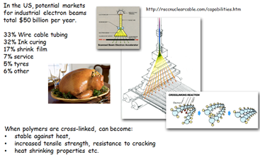 “A beam of the right particles with the right energy at the right intensity can shrink a tumour, produce cleaner energy, spot suspicious cargo, make a better radial tire, clean up dirty drinking water, map a protein, study a nuclear explosion, design a new drug, make a heat-resistant automotive cable, diagnose a disease, reduce nuclear waste, detect an art forgery, implant ions in a semiconductor, prospect for oil, date an archaeological find, package a Thanksgiving turkey or…