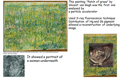 By directing synchrotron radiation onto 0.5 square mm ‘pixels’, it was possible to produce X-ray fluorescence intensity maps, reflecting the distribution of specific elements in the paint layers. In particular, the distribution of Hg mercury (red pigment) and Sb antimony (yellow pigment) allowed a reconstruction of the underlying image to be made.