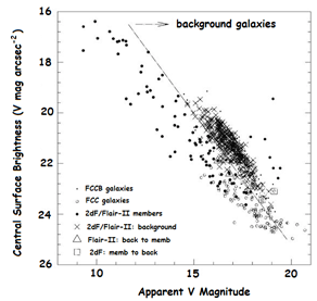 The following graph shows surface brightness–magnitude diagram for cluster members and background galaxies. Cluster members (from FCC): unconfirmed (open circles), confirmed by Flair-II/2dF (filled circles). Background galaxies (from FCCB): unconfirmed (points), confirmed by Flair-II (crosses). Triangles are Flair-II confirmed members originally classified as background galaxies. Squares are 2dF confirmed background galaxies originally classified as cluster members. The dashed line represents the segregation between populations (SB = 1.06V+ 4.16).