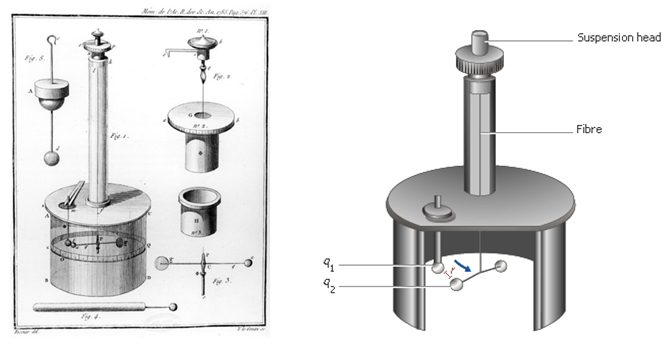 The torsion balance apparatus contains several parts but is relatively easy to replicate in order to reproduce Coulomb’s experiment. The top of the balance is a suspension head which is attached to a fibre that hangs through a column and hangs inside a lower glass cylinder. On this cylinder a paper scale marks the angular position. One of the charges is placed on a small conducting sphere that is able to transfer its charge through an opening at the top of the lower glass cylinder. The second charge is on a second conducting sphere placed inside the lower glass cylinder and is suspended from the fibre at a balanced crossbar.