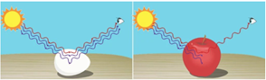 We detect objects because visible light is reflected off them and it is this reflected light that our eyes detect and label as colour if the light contains certain wavelengths. This is how objects effuse light; they absorb some wavelengths and scatter others. A white surface reflects all the light, whereas a dark surface absorbs every bit, reflecting nothing. We perceive an object as red because it absorbs all wavelengths of light except red, which is reflected.