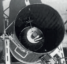 A standard-issue dustbin containing a Second World War parabolic signalling mirror only 25 cm in diameter, with a 5 cm diameter photomultiplier tube (PMT) at its focus, along with an amplifier and an oscilloscope.