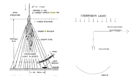 Above left is a cartoon drawn by Jelley of the atmospheric Cherenkov shower phenomenon. Above right is a diagram showing the essential elements of an atmospheric Cherenkov detector.