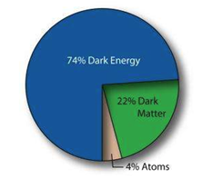 The standard cosmological model which predicts that the Universe is dominated by 74% dark energy (CMB, Supernovae) and 22% dark matter. The remaining 4% are the atoms of ordinary matter that we see around us (the area researched by astrophysicists). Thus in this model 96% of the Universe is dark. (Credit: NASA/WMAP Science Team)