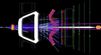 A beam of protons enters the LHCb detector on the left, creating a B0s particle, which decays into two muons (purple tracks crossing the whole detector). (Image: LHCb/CERN)