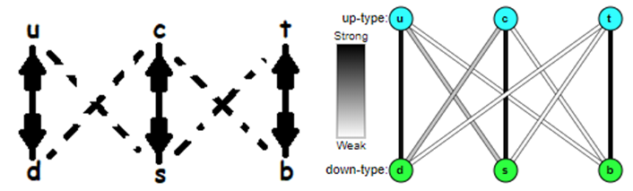 Above right: The strengths of the weak interactions between the six quarks. The “intensities” of the lines are determined by the elements of the CKM matrix.
