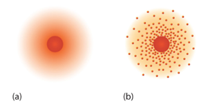 An alpha particle is a sub-microscopic, positively charged particle of matter. According to Thomson’s model, if an alpha particle were to collide with an atom, it would just fly straight through, its path being deflected by at most a fraction of a degree. At the atomic scale, the concept of “solid matter” is meaningless, so the alpha particle would not bounce off the atom like a marble. It would be affected only by the atom’s electric fields, and Thomson’s model predicted that the electric fields in an atom are too weak to affect a passing alpha particle much (alpha particles tend to move very fast). Both the negative and positive charges within the Thomson atom are spread out over the atom’s entire volume. According to Coulomb’s Law, the less concentrated a sphere of electric charge is, the weaker its electric field at its surface will be.