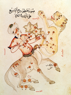 Most of the Arabic star names we know today can be traced back to the treatises of al-Sufi, a Persian astronomer of the 10th century who wrote in Arabic. His Book of Constellations of the Fixed Stars built on Ptolemy’s second-century Almagest. This plate is a 15th-century interpretation of al-Sufi’s constellations of Centaurus and Leo.