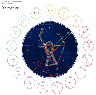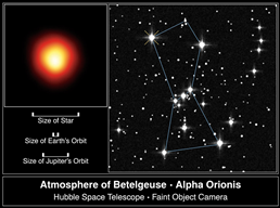 Betelgeuse (pronounced beetle-jooz or sometimes bet-el-juice) is an odd name—but then most of the common star names sound strange to the western ear. The reason is that most of them are of Arabic origin: Aldebaran (“The Follower”), Algol (“The Ghoul”), Arrakis (“The Dancer”), Deneb (“Tail”), Fomalhaut (“The Fish’s Mouth”), Rigel (“Foot”), Thuban (“Snake”), Vega (“Plunging [Eagle]”).… The list goes on.