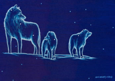 In The Dog Star story, Atima Atchakosuk, Polaris is called Mahkan Atchakos, the wolf star. Long ago the people had no dogs to protect them. Their relatives the wolf, coyote, and fox saw this. The wolves held a council and decided that two of them would go to live with the people, as did the coyote’s and foxes’ councils. Two pups from each council were also sent to all the four directions of humankind. They adapted and were domesticated. From these four came all the dogs in the world, and now they guard our homes and camps. To honour this sacrifice by the natootim-uk (our relatives) the Creator placed a reminder in the heavens. Polaris anchors the leash as the dogs run around their sky camp. The three stars of the little dipper handle represent the wolf (Polaris), coyote, and fox. The four bowl stars represent the pups sent to the four directions of humankind.