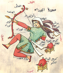 The odd name of Betelgeuse, in the constellation Orion, comes from an Arabic original whose first letter was inadvertantly changed by a 13th-century astronomer. Second brightest in Orion, the star that was originally named in Arabic yad al-jawza’ appears (top) at the upper left, and above, in an antique-style rendition, at the end of the sleeve of the hunter’s tunic.