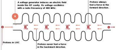 Chambers along the LHC use radio waves to pass energy to the protons as they hurtle past, making them move faster and faster. Then, at four points along the LHC tunnel, the bunches of protons – each containing 100bn particles – are made to cross and collide.