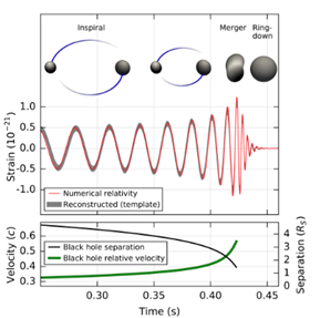 Some key results of our analysis of GW150914, comparing the reconstructed gravitational-wave strain (as seen by H1 at Hanford) with the predictions of the best-matching waveform computed from general relativity, over the three stages of the event: inspiral, merger and ringdown. Also shown are the separation and velocity of the black holes, and how they change as the merger event unfolds. Credit: LIGO.