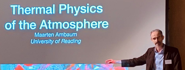 Weather forecasting requires the description, understanding, and prediction of the fluid dynamics, the thermodynamics, and their interaction in the atmosphere. In this talk Professor Ambaum discussed some of the unique challenges around the thermodynamics of the atmosphere. The underlying physics is in principle mostly known (He pointed to some parts that are yet unknown), but the operation of that physics over a vast range of scales presents truly unique and exciting challenges.