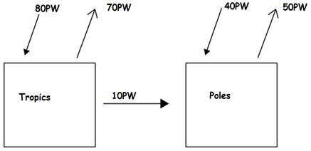 Energy in to the Earth (120PW) = the energy out of the Earth (120PW) although in reality 170PW is received from the Sun, 120PW is absorbed and 50PW is reflected.
