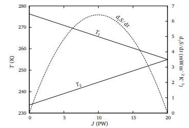 Results for the two-box model of the Earth system for varying poleward heat flux J. Solid lines: radiation temperature of equatorial region, T1, and polar region, T2. Dashed line: irreversible entropy production due to the poleward meridional heat flux. The entropy production is expressed per unit area on Earth.