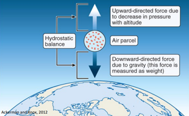 In fluid mechanics, a fluid is said to be in hydrostatic equilibrium or hydrostatic balance when it is at rest, or when the flow velocity for each parcel of fluid is constant over time. This occurs when external forces such as gravity are balanced by a pressure-gradient force. For instance, the pressure-gradient force prevents gravity from collapsing Earth’s atmosphere into a thin, dense shell, whereas gravity prevents the pressure gradient force from diffusing the atmosphere into space.