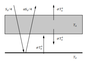 Paths of radiative fluxes in a system made of a single, cloud-free slab atmosphere at temperature TA, with unit emissivity in the long-wave and zero emissivity in the short-wave part of the spectrum. The insolation is S0/4. The planetary short-wave albedo s is here provided by the Earth’s surface alone.