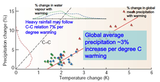 6.5%/7% increase in water vapour in atmosphere for each degree increase in temperature. However, rain is not limited by the amount of water in the atmosphere. It is limited by the energy budget of the atmosphere.