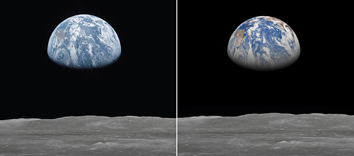 NASA Apollo 11 image of the Earth above the Moon taken on 20 July 1969 at around 05h UTC (left) and the corresponding pseudo-image generated from a 29-hour 28-km resolution ECMWF forecast initialised from ERA40 data (right). Both images are centred over the western Pacific Ocean, with the equator running almost vertically and Australia visible on the left in brownish colour.