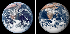 NASA Apollo 17 image of the Earth taken on 7 December 1972 at 10h39 UTC (left) and the corresponding pseudo-image generated from an 11-hour 9-km resolution ECMWF forecast initialised from ERA5 reanalysis (right).