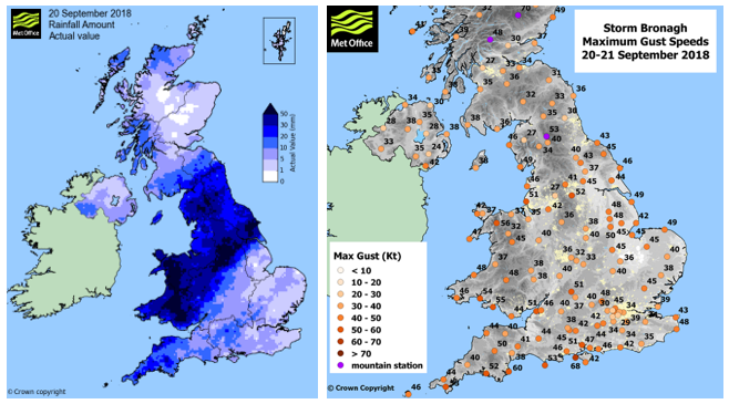 The map below left shows the daily rainfall totals 0900 UTC 20 to 0900 UTC 21 September 2018 from storm Bronagh. Upland areas of Wales, the southern Pennines and North York Moors recorded over 50mm of rain, with 78.6mm at Capel Curig (Conwy) and 71.6mm at Middleton (Derbyshire). Both mid-Wales and the Sheffield area experienced localised flooding.