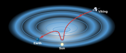 Time Delays for Radio Waves near the Sun: Radio signals from the Viking lander on Mars were delayed when they passed near the Sun, where spacetime is curved relatively strongly. In this picture, spacetime is pictured as a two-dimensional rubber sheet.