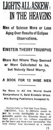 As a naive theorist, Einstein wrote to George Hale, the director of Mount Wilson Observatory, wanting to know “how close to the Sun fixed stars could be seen in daylight”. Hale explained that exploiting a solar eclipse would be more promising.