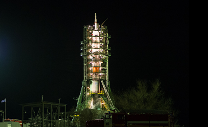The Soyuz TMA-15M spacecraft is seen on the launch pad just prior to launch on Monday, Nov. 24, 2014 at the Baikonur Cosmodrome in Kazakhstan. Launch of the Soyuz rocket is scheduled for the early hours of Nov. 24 and will carry Expedition 42 Soyuz Commander Anton Shkaplerov of the Russian Federal Space Agency (Roscosmos), Flight Engineer Terry Virts of NASA , and Flight Engineer Samantha Cristoforetti of the European Space Agency into orbit to begin their five and a half month mission on the International Space Station.