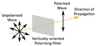 The operation of a polarising filter, converting an unpolarised wave into a polarised wave. The arrows represent the directions in which the wave oscillates.
