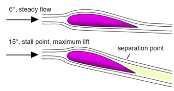 In general, if the airflow over the aeroplane breaks away from the surface or becomes even, then swirls and eddies of turbulent air form, wasting energy and spoiling the effect of the aerofoils.