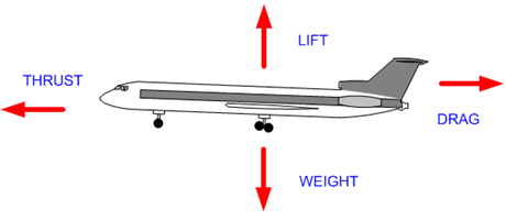 Now you might be asking yourself about drag and weight. Well drag is simply the force of air acting on the plane pushing it backwards as the plane is pushing on the air forwards. So, air is needed to push the plane forwards but it is, unfortunately, the source of the forces trying to stop it moving forwards.