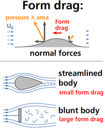 Frictional drag and form drag are different. Frictional drag is due to the normal forces that result when a fluid flows over a surface. When the surface is rough there tends to be more frictional drag than when the surface is smooth. Form drag, on the other hand, is due to the normal forces that result when a fluid flows over an object creating areas of high and low pressure. Form drag is calculated by taking the integral of the pressure on the surface times the slope of the object over the entire surface area of the object. In general, streamlined bodies have smaller form drag than bluff bodies.