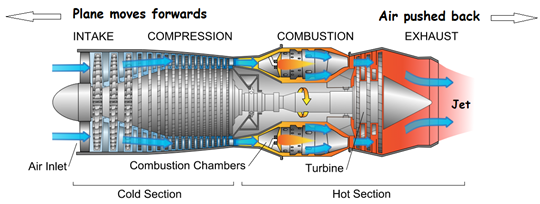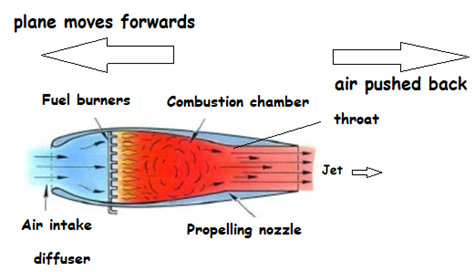 This collects air at the front as the aircraft move forwards. The air is heated and then squeezed past a narrow “throat”, and both of these things speed up the air. The airflow through the “throat” speeds up in the same way as the airflow over an aerofoil. The air then comes out of the back faster than it went in at the front, giving thrust.